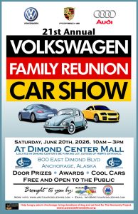 The 21st annual Volkswagen Family Reunion Car Show will be held on Saturday, June 20th, 2026 at Dimond Center Mall’s SE parking lot. We invite you to come see the cars, and vote for your favorites. Awards will be given for best Volkswagen, Porsche, Audi, “Not a VW”, Beater, and also Best of Show.